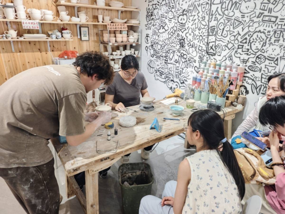 这家店的忙碌只是缩影。在景德镇雕塑瓷厂附近,记者观察到超过20家陶艺体验店在此密集分布,竞争激烈,不少店员主动在街上招揽顾客,全流程价格更是低至百元以内。