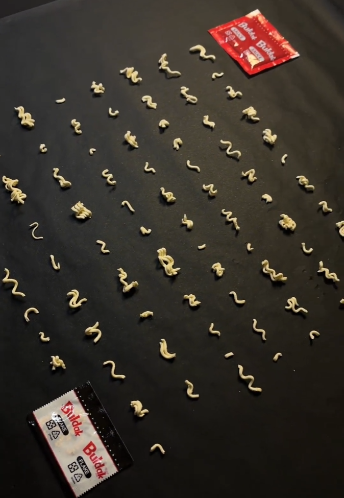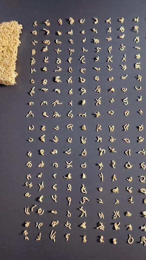 但不得不承认,这些方便面碎片造型弯曲错落,远看酷似大篆之类的商周时期文字,这创意,挺佩服的!!!